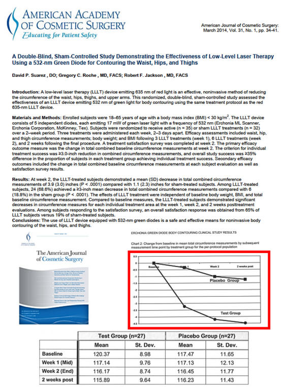 **資料來源:A Randomized, Double-blind, Placebo-Controlled Study Using Low-Level Laser Therapy for Reducing Hip, Waist and Upper Abdomen Circumference of Obese Individuals。相關原文:LLLT safely and effectively reduced the hip, thigh and abdomen circumference of persons with a BMI of 30-40 kg/m².Fifty-three subjects were randomized to the LLLT (N=28) and the placebo groups (N=25). Among subjects in the LLLT group, 71.43% attained a ≥3-inch decrease in combined circumference measurements vs. 12% in the sham group (p<0.00005). Among subjects with a ≥3-inch decrease, the mean decrease was 6 inches. Most subjects (79%) in the LLLT groups were Very Satisfied or Somewhat Satisfied with the results they achieved vs. 16% of sham-treated subjects. There were no changes in body weight or BMI. There were no reports of adverse events.